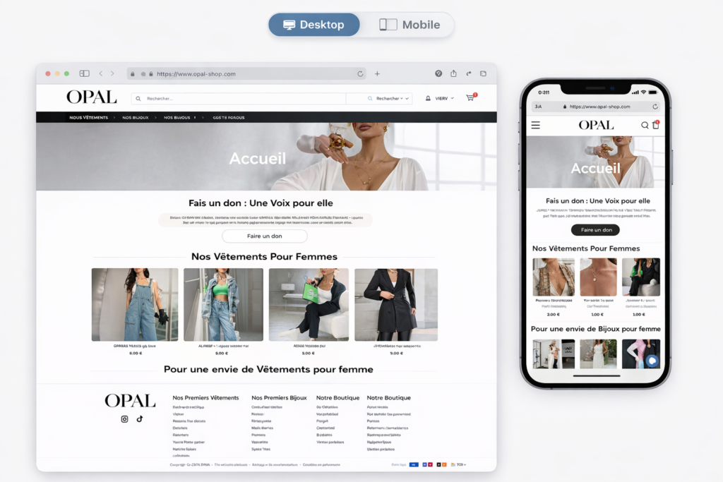 Un site e-commerce prêt à vendre, permettant à la marque de lancer ses ventes en ligne efficacement et de développer son activité.